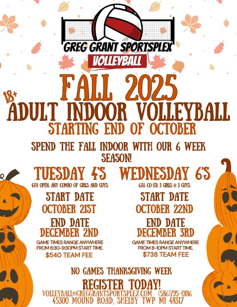 Adult Indoor Fall Volleyball 2025 SIGN UP A 4X4 OPEN TEAM SIGN UP A 6X6 COED TEAM Questions, comments or concerns? Feel free to reach us at (586) 795-0186 or contact us online.Games played at:45300 Mound Rd, Shelby Township, MI 48317Volleyball specific questions can be directed to volleyball@greggrantsportsplex.com