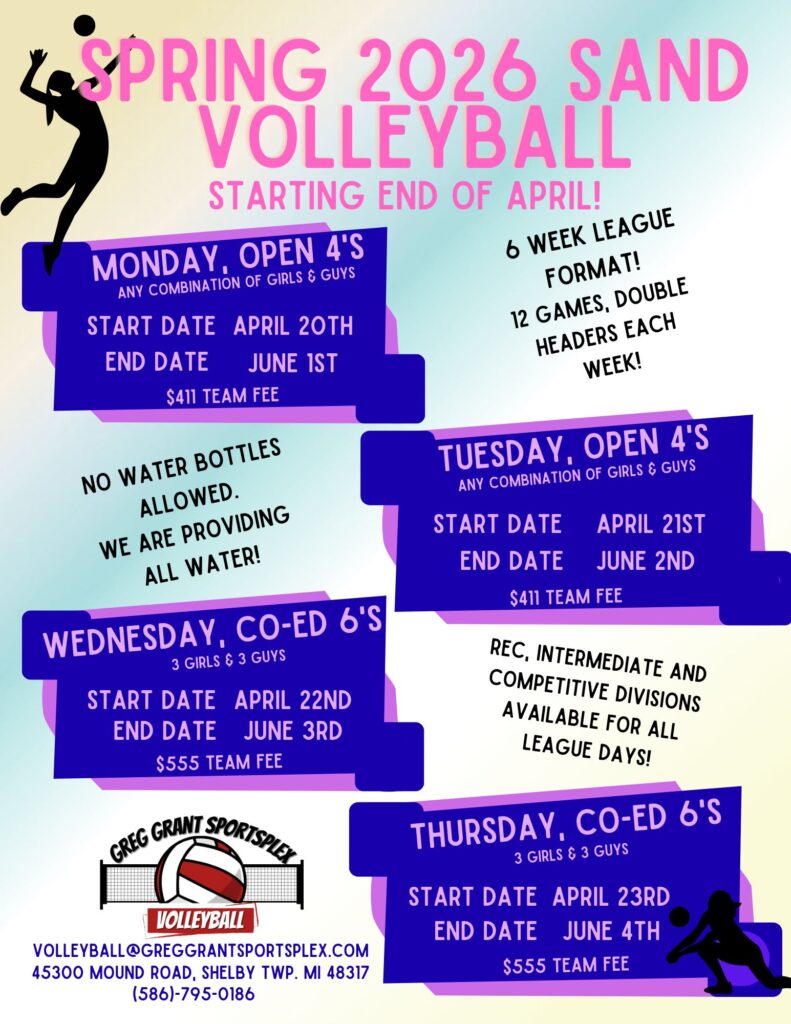 Adult Sand Volleyball Spring 2026 SIGN UP A TEAM HERE Questions, comments or concerns? Feel free to reach us at (586) 795-0186 or contact us online.Games played at:45300 Mound Rd, Shelby Township, MI 48317Volleyball specific questions can be directed to volleyball@greggrantsportsplex.com