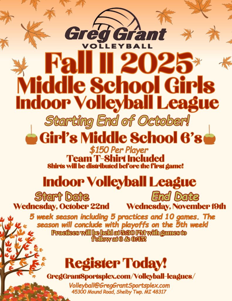 Fall II 2025 Youth Indoor Volleyball SIGN UP FOR YOUTH 6TH-8TH GRADE Questions, comments or concerns? Feel free to reach us at (586) 795-0186 or contact us online.Games played at:45300 Mound Rd, Shelby Township, MI 48317Volleyball specific questions can be directed to volleyball@greggrantsportsplex.com
