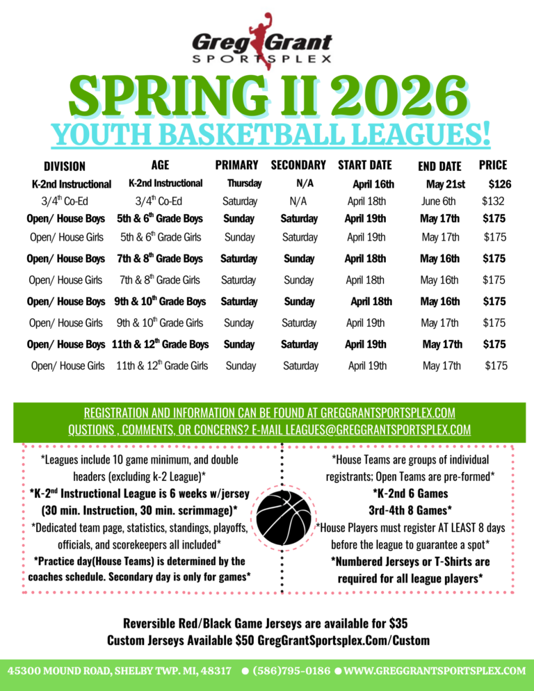 Spring II 2026 Basketball League SIGN UP A YOUTH PLAYER OR TEAM Questions, comments or concerns? Feel free to reach us at (586) 795-0186 or contact us online. DOWNLOAD AS PDF