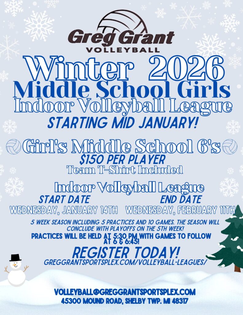 Winter 2026 Youth Indoor Volleyball SIGN UP TODAY Games played at:45300 Mound Rd, Shelby Township, MI 48317Volleyball specific questions can be directed to volleyball@greggrantsportsplex.com